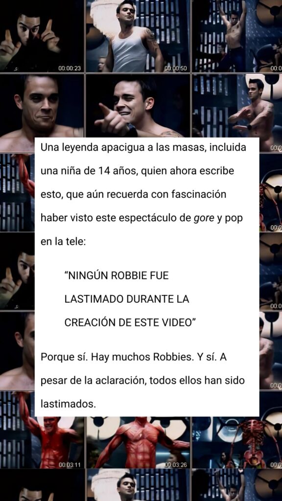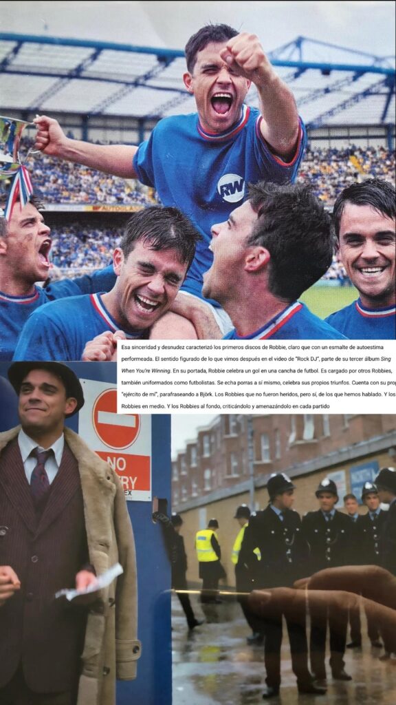 Esa sinceridad y desnudez caracterizó los primeros discos de Robbie, claro que con un esmalte de autoestima performeada. El sentido figurado de lo que vimos después en el video de “Rock DJ”, parte de su tercer álbum Sing When You’re Winning. En su portada, Robbie celebra un gol en una cancha de futbol. Es cargado por otros Robbies, también uniformados como futbolistas. Se echa porras a sí mismo, celebra sus propios triunfos. Cuenta con su propio “ejército de mí”, parafraseando a Björk. Los Robbies que no fueron heridos, pero sí, de los que hemos hablado. Y los Robbies en medio. Y los Robbies al fondo, criticándolo y amenazándolo en cada partido.