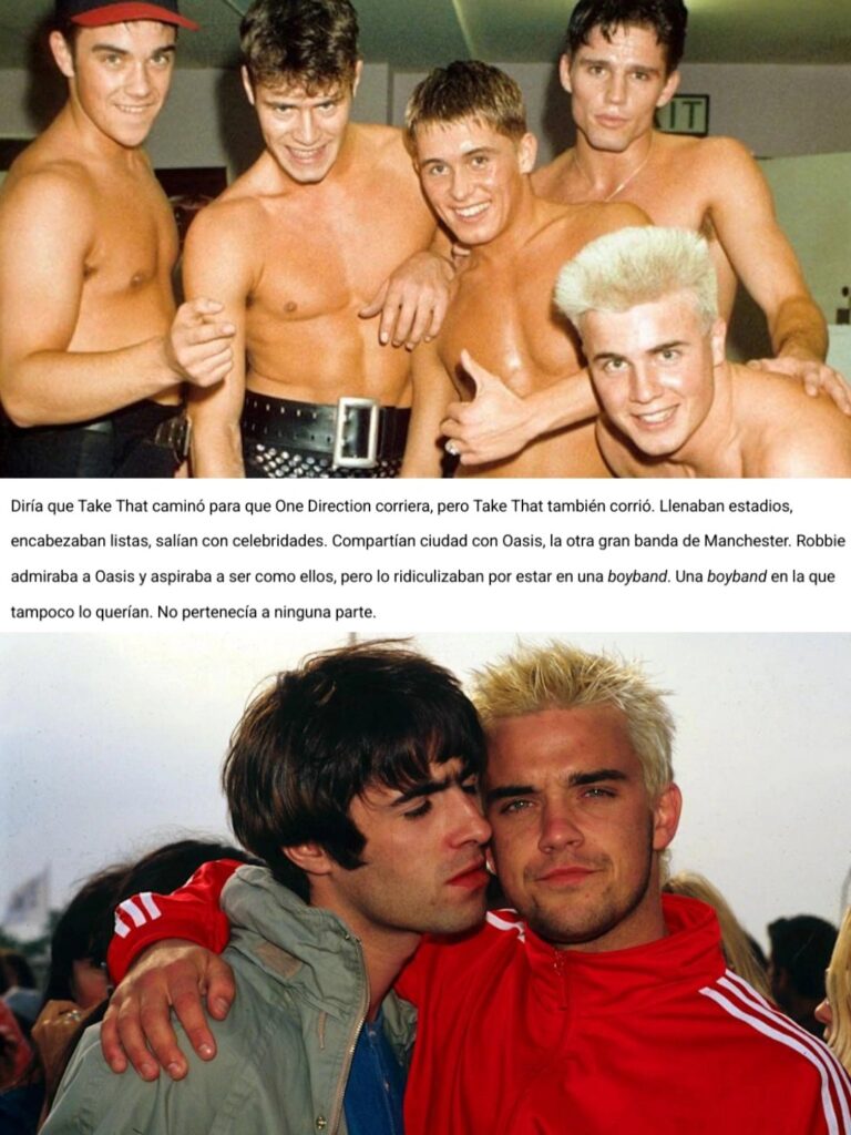 Diría que Take That caminó para que One Direction corriera, pero Take That también corrió. Llenaban estadios, encabezaban listas, salían con celebridades. Compartían ciudad con Oasis, la otra gran banda de Manchester. Robbie admiraba a Oasis y aspiraba a ser como ellos, pero lo ridiculizaban por estar en una boyband. Una boyband en la que tampoco lo querían. No pertenecía a ninguna parte.