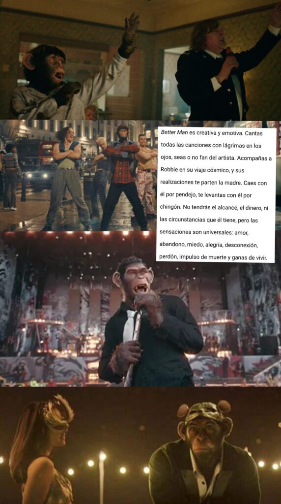 Better Man es creativa y emotiva. Cantas todas las canciones con lágrimas en los ojos, seas o no fan del artista. Acompañas a Robbie en su viaje cósmico, y sus realizaciones te parten la madre. Caes con él por pendejo, te levantas con él por chingón. No tendrás el alcance, el dinero, ni las circunstancias que él tiene, pero las sensaciones son universales: amor, abandono, miedo, alegría, desconexión, perdón, impulso de muerte y ganas de vivir.