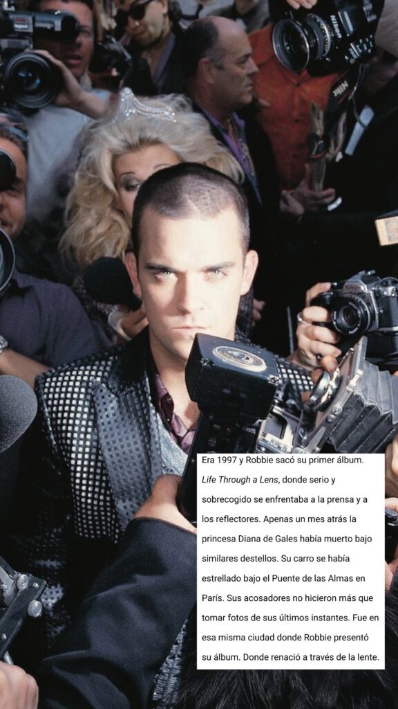 Era 1997 y Robbie sacó su primer álbum. Life Through a Lens, donde serio y sobrecogido se enfrentaba a la prensa y a los reflectores. Apenas un mes atrás la princesa Diana de Gales había muerto bajo similares destellos. Su carro se había estrellado bajo el Puente de las Almas en París. Sus acosadores no hicieron más que tomar fotos de sus últimos instantes. Fue en esa misma ciudad donde Robbie presentó su álbum. Donde renació a través de la lente.