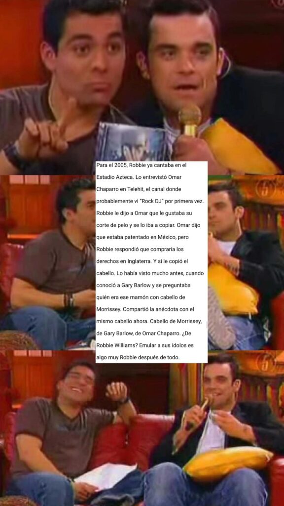 Para el 2005, Robbie ya cantaba en el Estadio Azteca. Lo entrevistó Omar Chaparro en Telehit, el canal donde probablemente vi “Rock DJ” por primera vez. Robbie le dijo a Omar que le gustaba su corte de pelo y se lo iba a copiar. Omar dijo que estaba patentado en México, pero Robbie respondió que compraría los derechos en Inglaterra. Y sí le copió el cabello. Lo había visto mucho antes, cuando conoció a Gary Barlow y se preguntaba quién era ese mamón con cabello de Morrissey. Compartió la anécdota con el mismo cabello ahora. Cabello de Morrissey, de Gary Barlow, de Omar Chaparro. ¿De Robbie Williams? Emular a sus ídolos es algo muy Robbie después de todo.