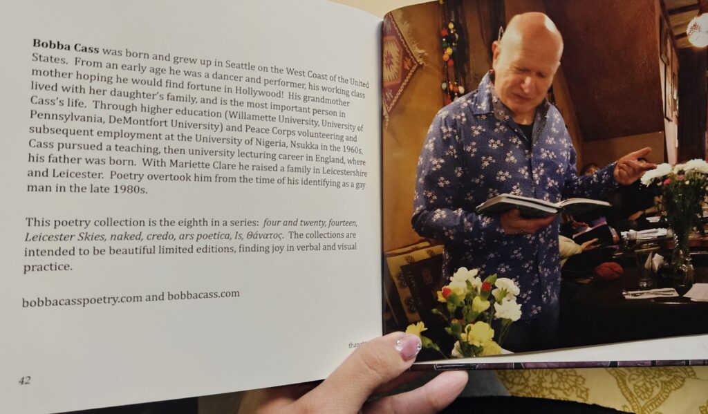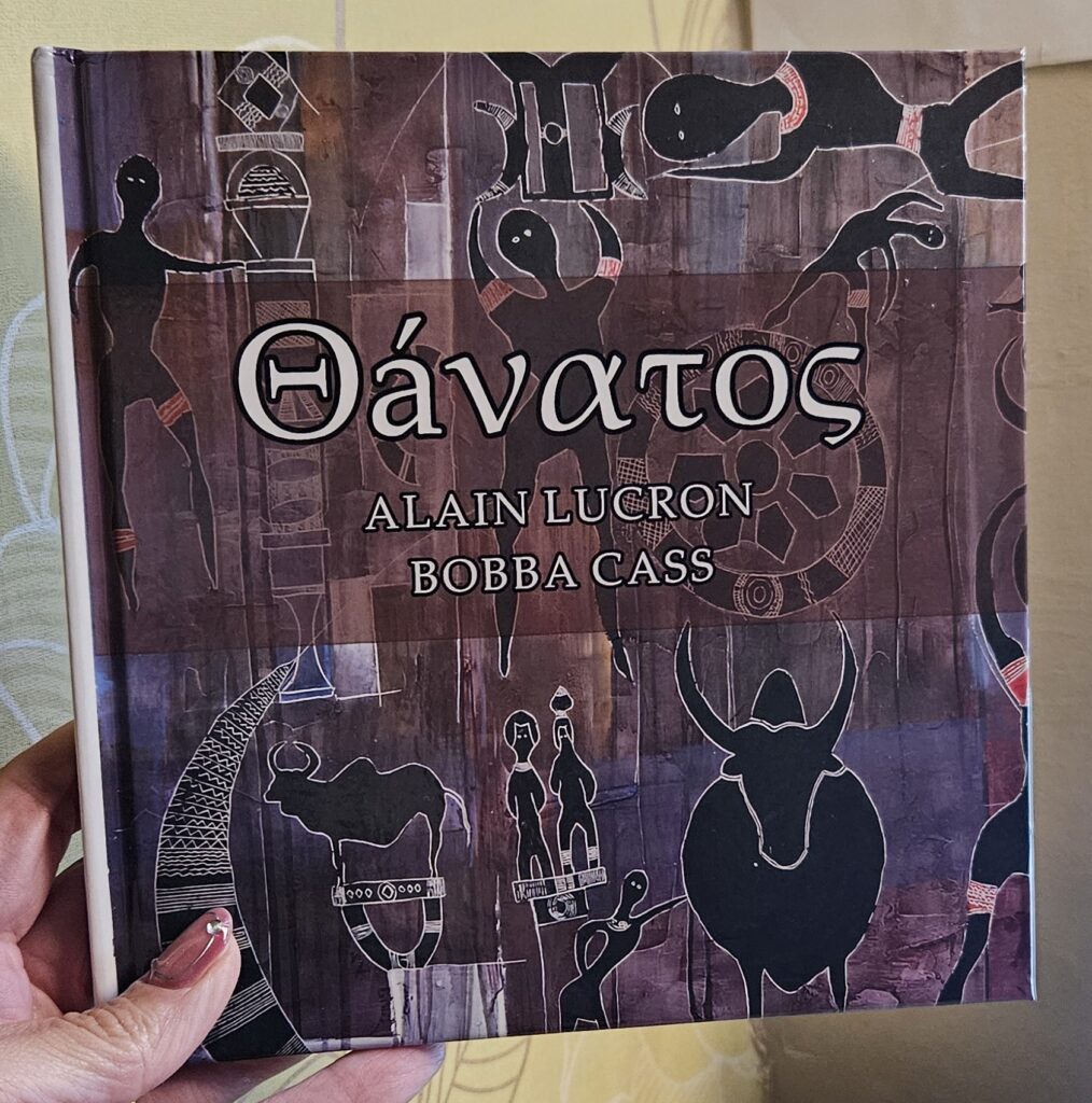 Bobba gave me a copy of his book Θáνατος (Thanatos), a series of poems about death, alongside paintings in which Alain Lucron honours funeral rites from his birth place of Madagascar. It was published in 2024 by Anerki Arts and Fox Books Ltd. On its pages, tribute is paid to other poets and personalities that, although their physical presence is no longer here, their legacy is as alive as ever.