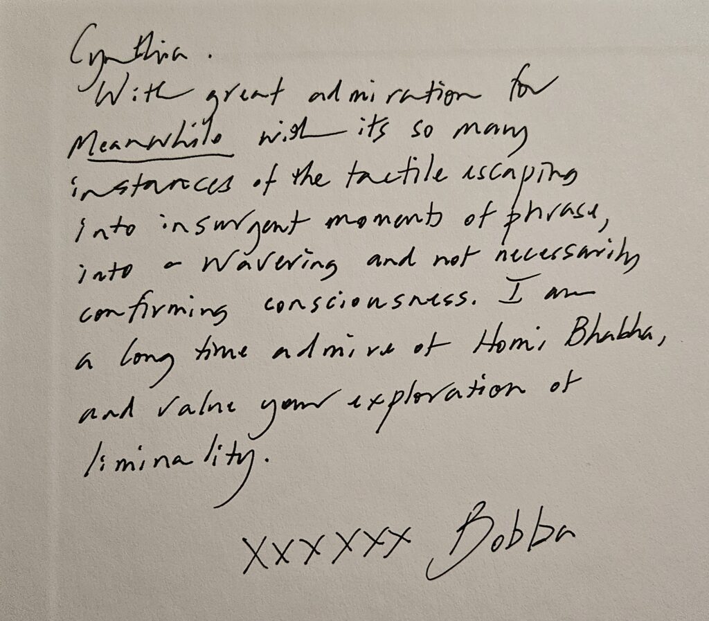 With great admiration for Meanwhile with its so many instances of the tactile escaping into insurgent moments of phrase, into a wavering and not necessarily confirming consciousness. I’m a long time admirer of Homi Bhabha and value your exploration of liminality.